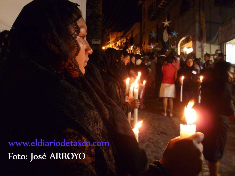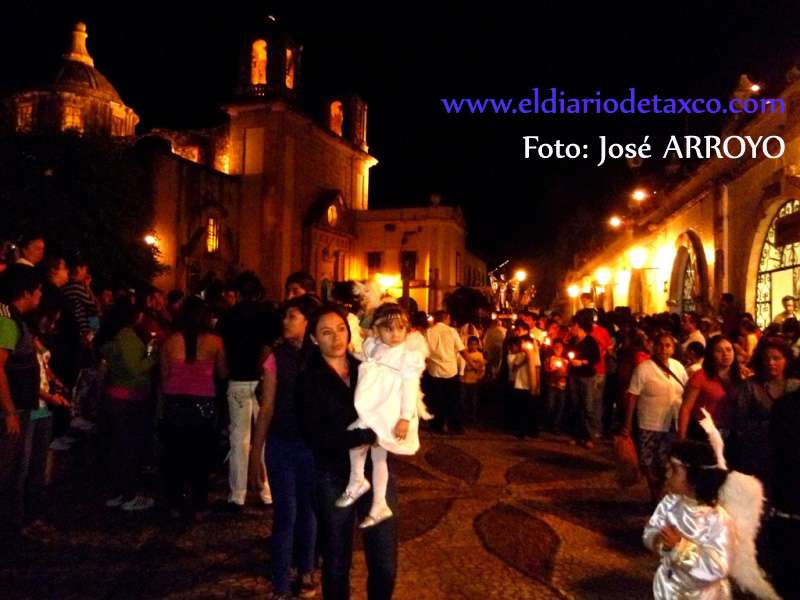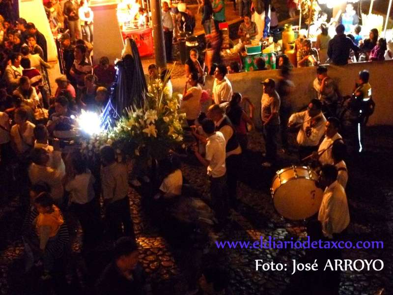 TAXCO DE ALARCON, Gro. 21 de marzo 2016.-En este pueblo mágico, al sonar las primeras notas armoniosos de la música de chirimías mezcladas por instrumentos musicales y ejecutados por músicos autodidactas del violín, tamborcillo y tambor, además de una pequeña campanita movida por niños del barrio y templo de San Miguel Arcángel, alrededor de las 10 de la noche del Lunes Santo, inició la primera procesión nocturna dedicada a todas las advocaciones de las Virgen María. La procesión es precedida por la Virgen de la Natividad que se venera el templo de Guadalupe y al acto extralitúrgico asistieron cientos de gentes, en su mayoría mujeres vestidas unos de negro y otras de blanco para acompañar y alumbrar con velas sus imágenes.
