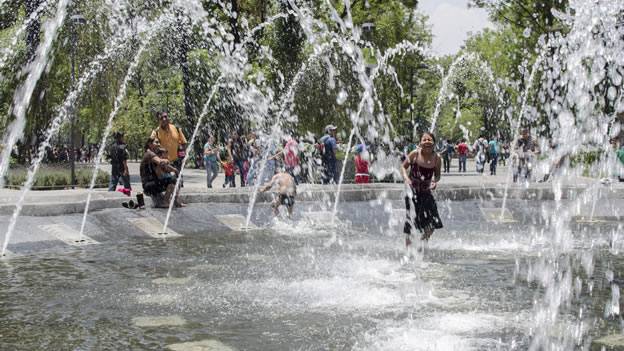 Varios niños juegan en una fuente de la Alameda Central de la Ciudad de México ante las altas temperaturas de este miércoles (Cuartoscuro).